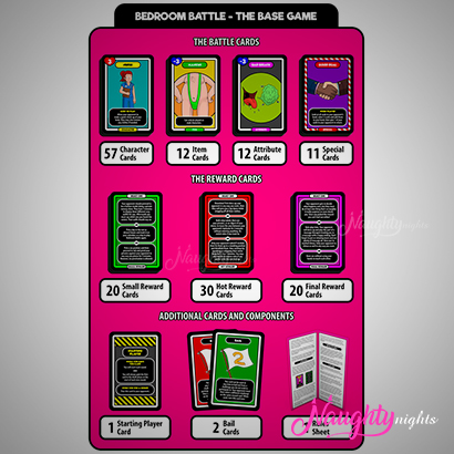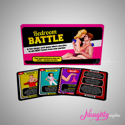 Bedroom Battle is a strategic sex game for couples (of any gender) where you play to win rewards in the form of sexy challenges. Each round you use battle cards to compete for reward cards containing three challenges to choose from, and then act out. The player who collects the most reward cards during the game wins, and gets to select a reward that is designed to bring both players to climax.