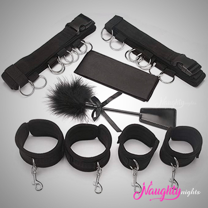 This set consists of 2 handcuffs, 2 ankle cuffs, 2 bed restraints, a tickler, and an eye mask. You can use these items together to enhance your bedroom experience or individually to surprise your partner in a new way each night.